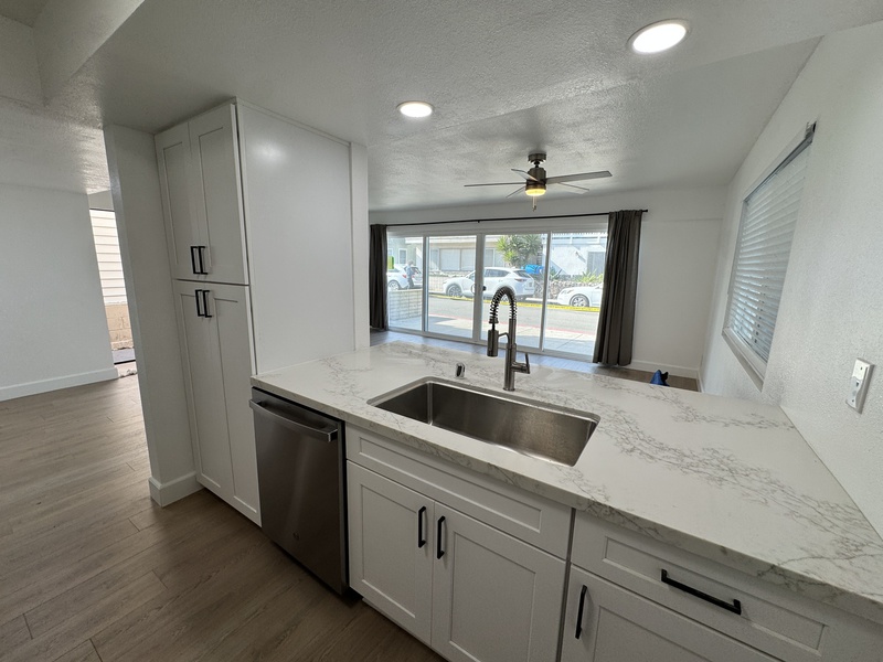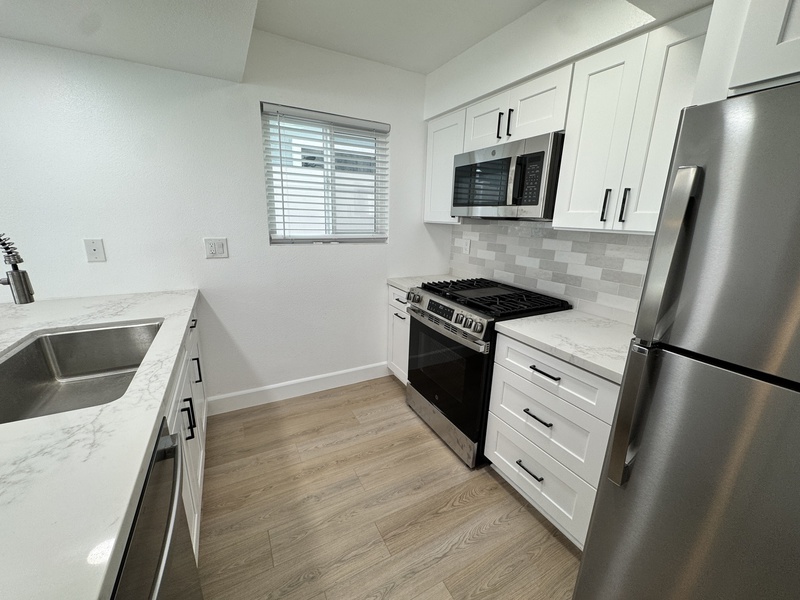 White quartz countertops, Shaker cabinetry, New stainless-steel appliances.