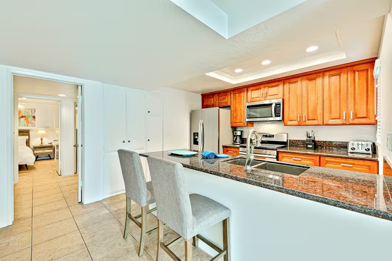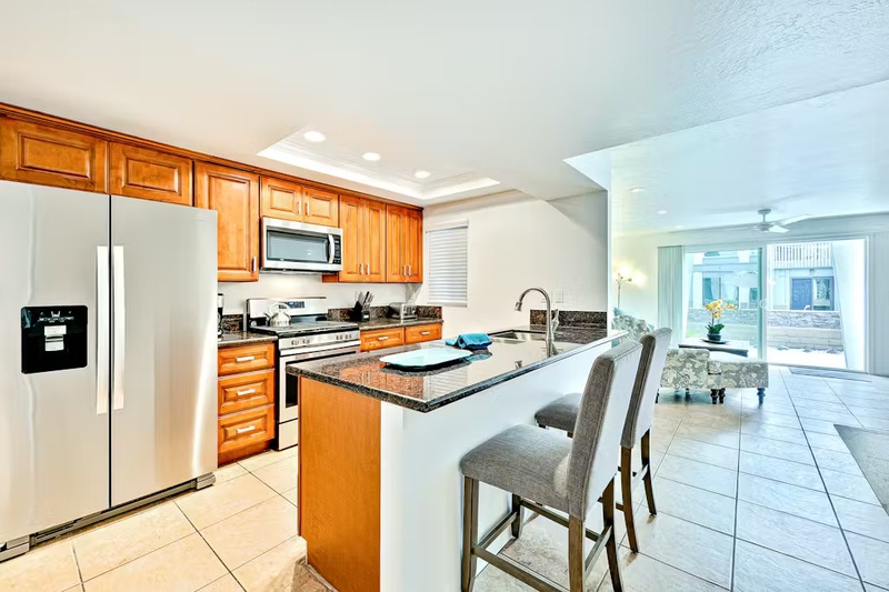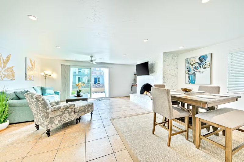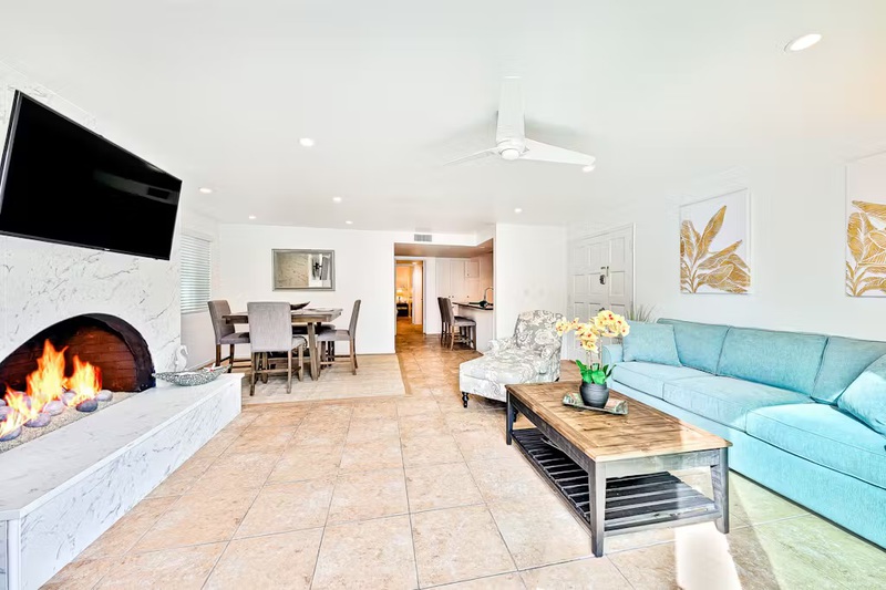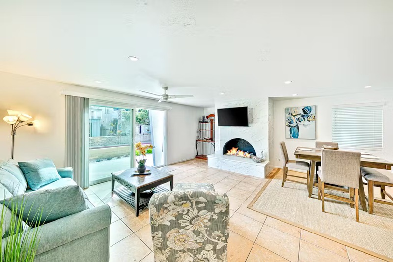 PROPERTY HIGHLIGHTS: Exclusive front patio for relaxing or entertaining. Fully furnished option or unfurnished and bring your own style. Open floor plan with a stunning marble fireplace. Ceiling fans in all bedrooms and living room, Remodeled kitchen and bathrooms with trending design and sleek finishes, Tile flooring throughout for easy maintenance and coastal charm