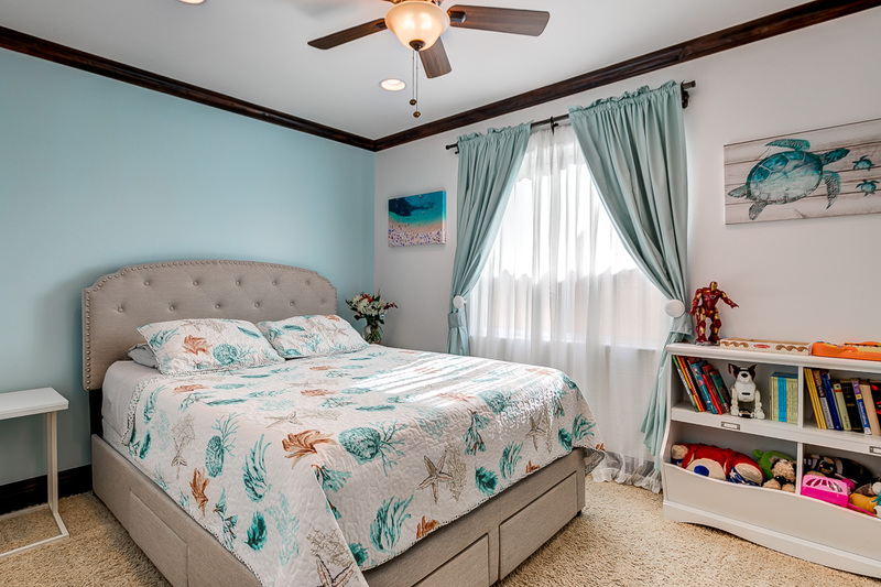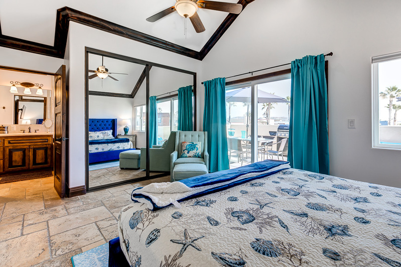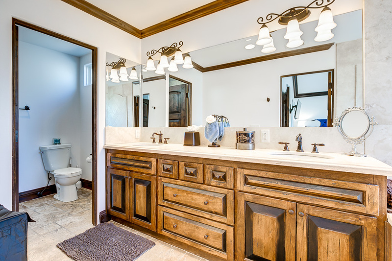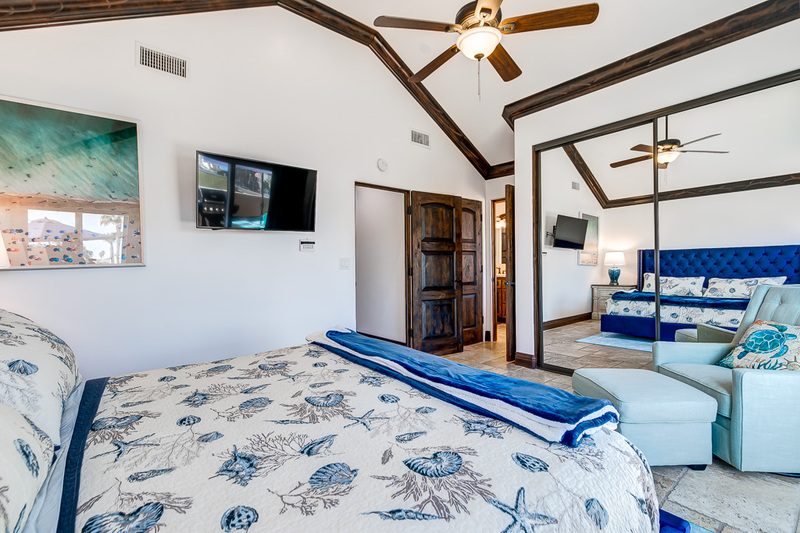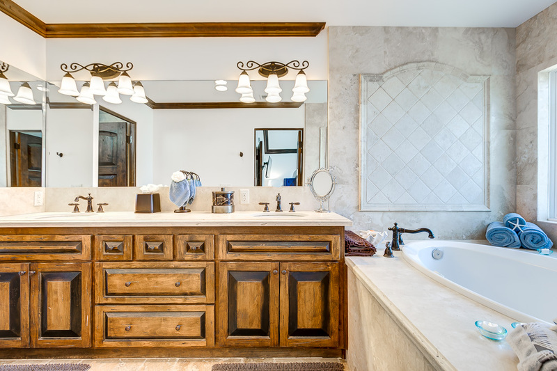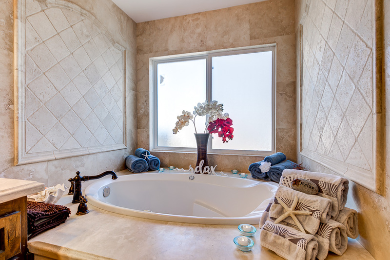 MASTER BEDROOMS AND BATHROOM: It is furnished with a king bedroom set, large walk in closet, 42" LED SMART TV, Alarm clock and joins with a luxury master bathroom with a dual vanity, jacuzzi tub and a custom tile stand up shower.