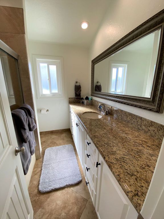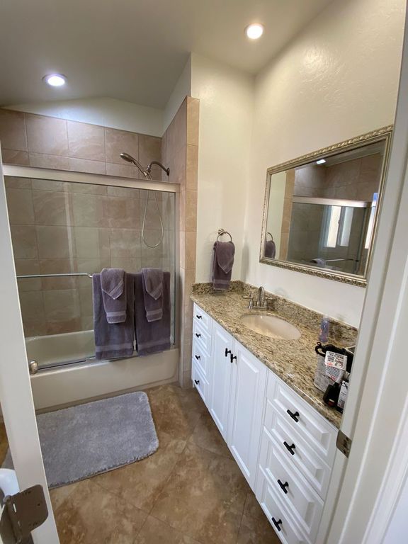 GUEST BATHROOM: Extra long single granite vanity sink with a tiled Tub/Shower