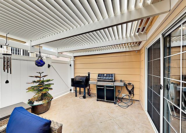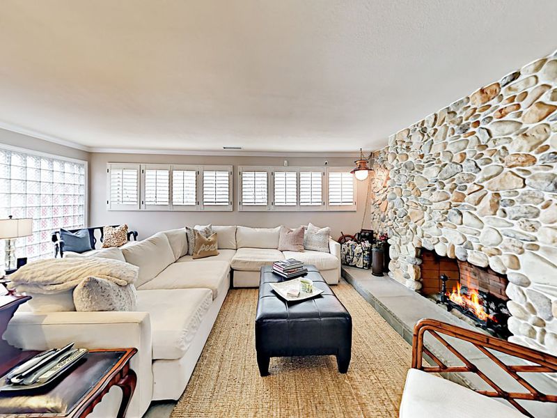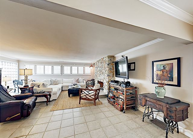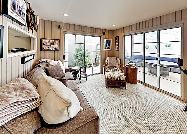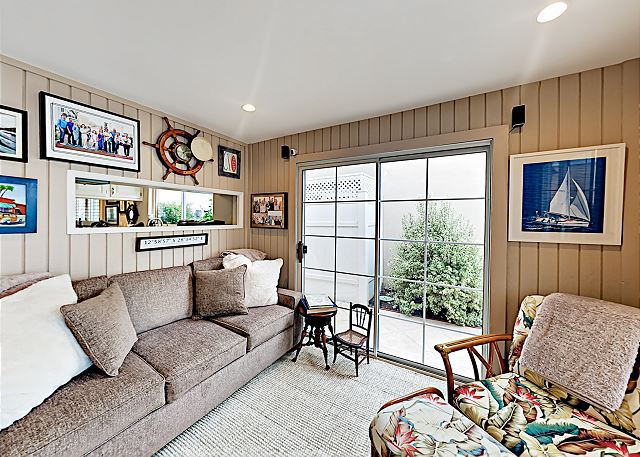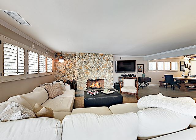 Located a short 5 minute walk from the beach and a short bike ride from the Newport and Huntington Piers, this beach-centric home features 1,801 square feet of beautifully designed living space, plus a private patio with a gas fire pit and gas grill. Relax in a tranquil, quiet, air conditioned, well-appointed single story family vacation home. The open floor plan has been tastefully decorated and will provide a lot of interest. Tile floors and a stone-detailed gas fireplace welcome you into the open-concept living room. An elegant sectional and an armchair offer plenty of seating for socializing or movie night on the 50” TV.