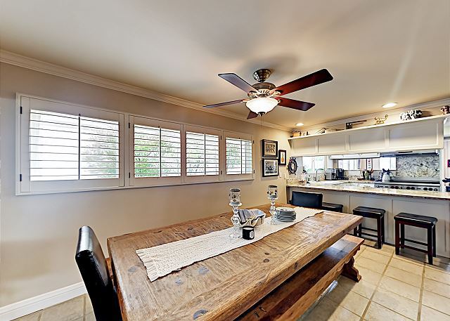 A wine fridge and servery cabinet add to the understated rustic utility of the dining area. The large dining table with bench seating for 8 provides casual flexibility for eating, hosting parties, building puzzles or playing games. A four seat breakfast bar faces the kitchen for relaxed conversations when preparing food or just simply talking over a glass of wine. This single-story home accommodates up to six guests between the three bedrooms.