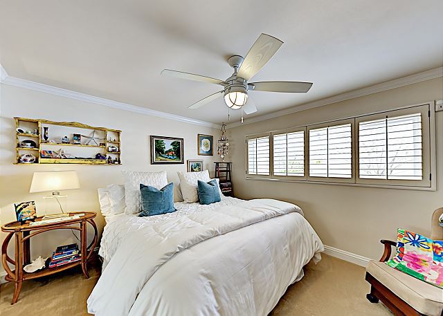 Another king-size bed awaits in the second bedroom, while the third guest room has a queen-size bed and a desk.