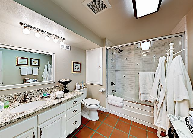 The guest bathroom is appointed with a tub/shower combination, a spacious granite vanity and a wall mounted ironing board for your convenience.