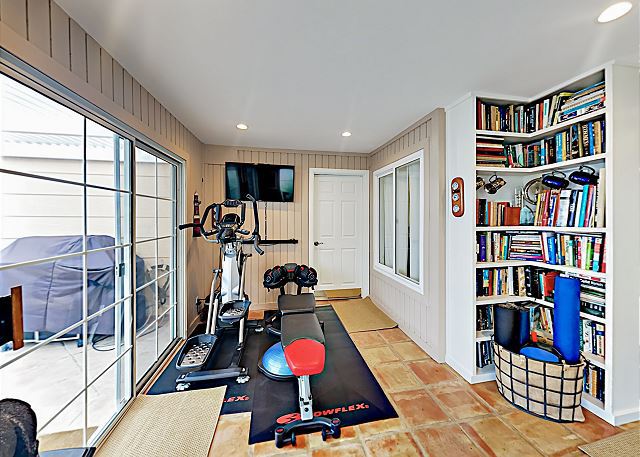 The reading room has a diverse selection of books, a comfortable chair and ottoman, a 3 seat pull-out sleeper couch for unexpected guests, and a small gym which is equipped with a Bowflex M7 machine, weight bench and miscellaneous pieces of gym kit for your convenience (use at your own risk).