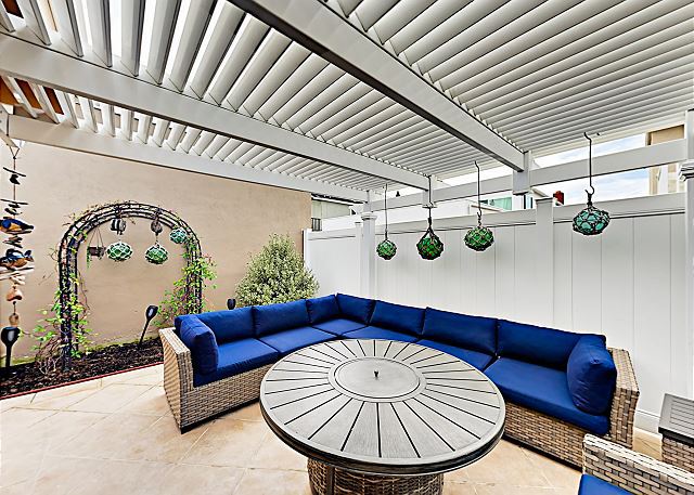 A secluded back patio has a gas BBQ, comfortable sectional furniture and a fire pit for relaxing evenings.