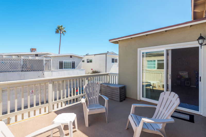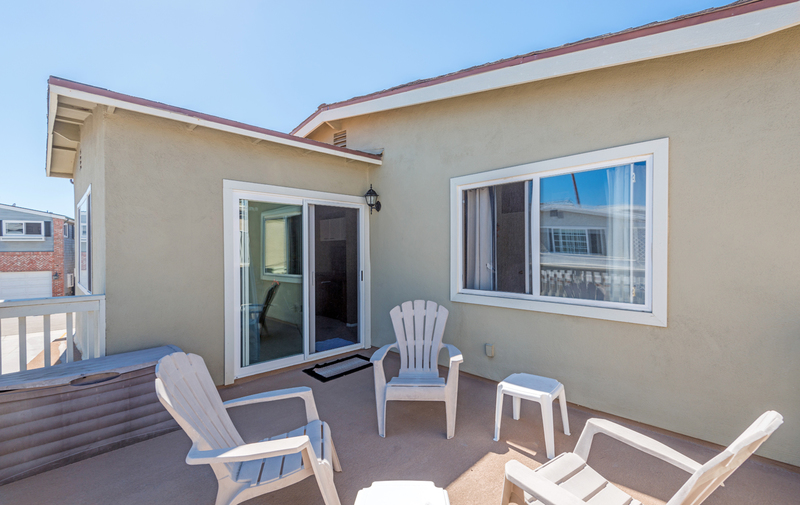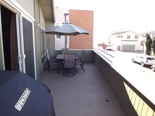 FRONT PATIO: has a beautiful view of the ocean and Catalina Island. It's roughly 50 sq ft with a 6 person patio set and umbrella, a propane BBQ and a 2 person table.