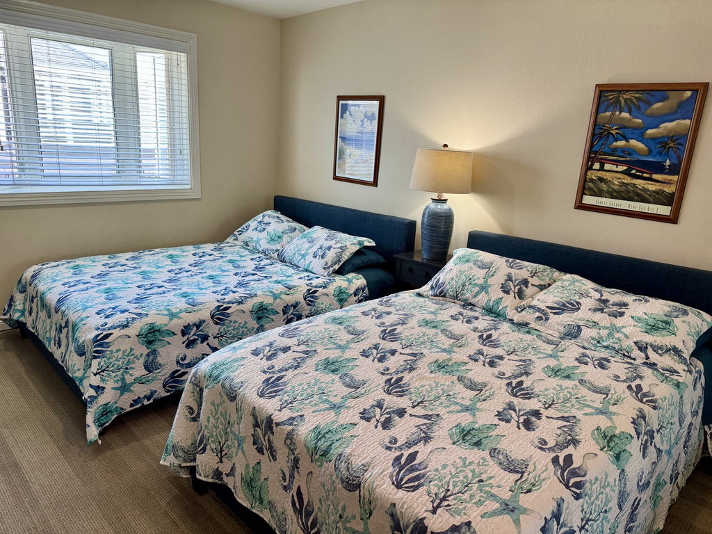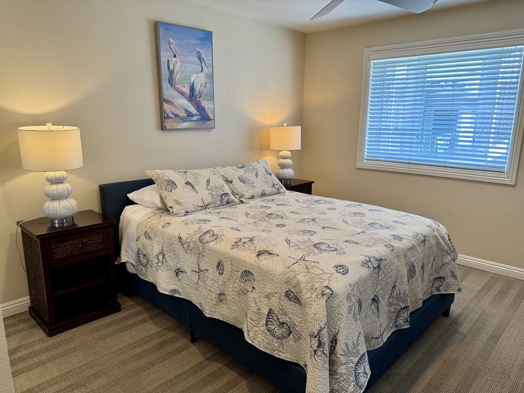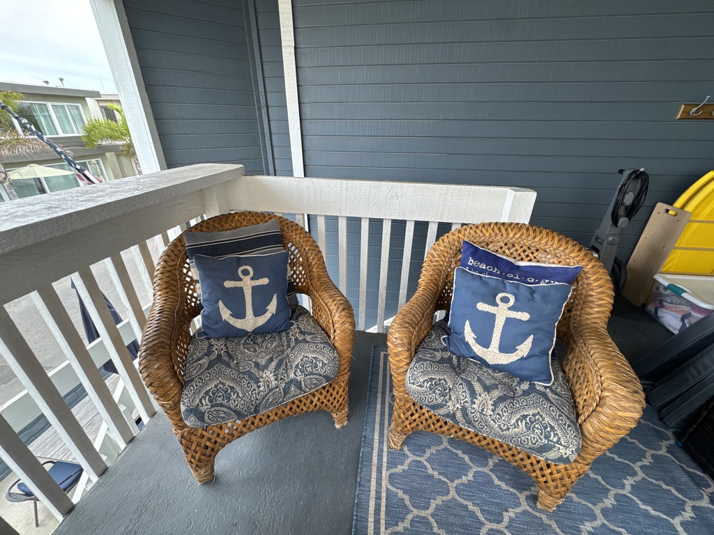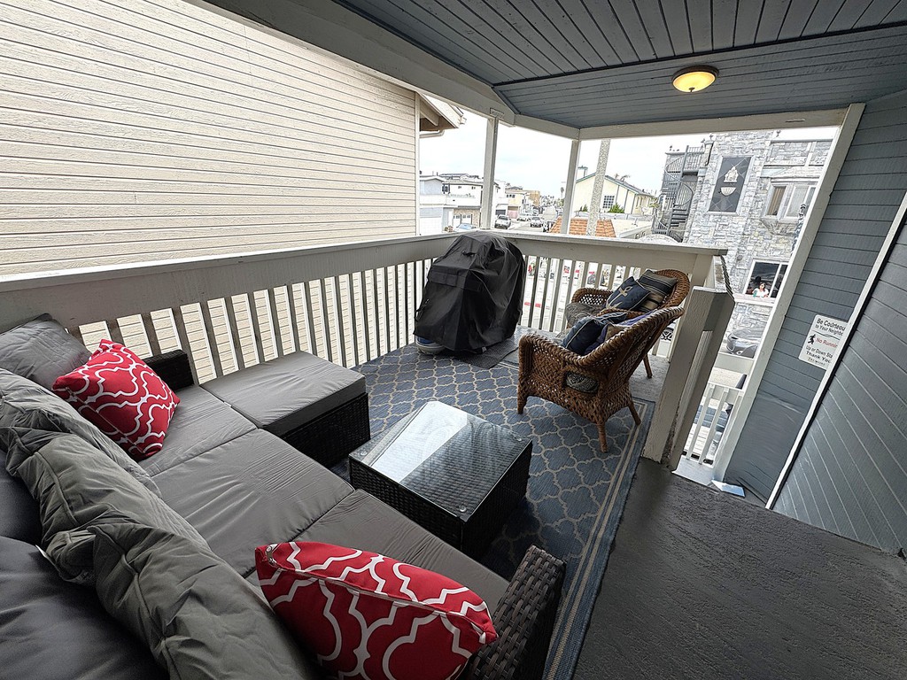 This beautiful 2nd story 2bedroom 2 bath beach house with wood floors throughout and shaggy carpet in all bedrooms consists of a open floor plan, flat screen cable TV's in all rooms (living room has Roku), a DVD player with DVD's, tasteful furniture, a 6 person dining room and a fully equipped kitchen. The Master Bedroom in the back of the house has a queen bed and an attached 3/4 size bathroom. The 2nd bedroom is equipped with a queen bed and 1 full bed. The 2nd full size bathroom is a shower/tub combo with vanity sink in separate room. The front entrance to the house has a great beach atmosphere with a covered patio (patio on right).