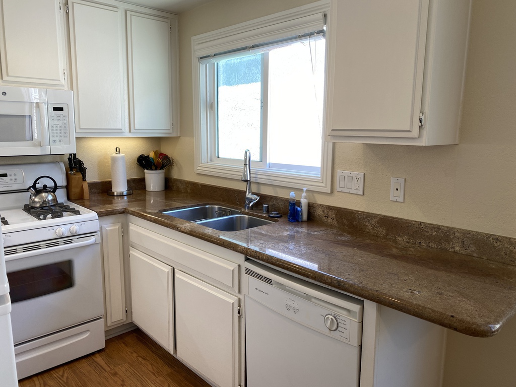 KITCHEN: Comes fully equipped for entertaining and cooking. Full size refrigerator, dishwasher, gas stove and microwave. Including but not limited to: Place settings for 6 for dining, pots/pans, blender, coffee maker, BBQ utensils, wine glasses, muffin tins, cooking spices, limited condiments and much more.