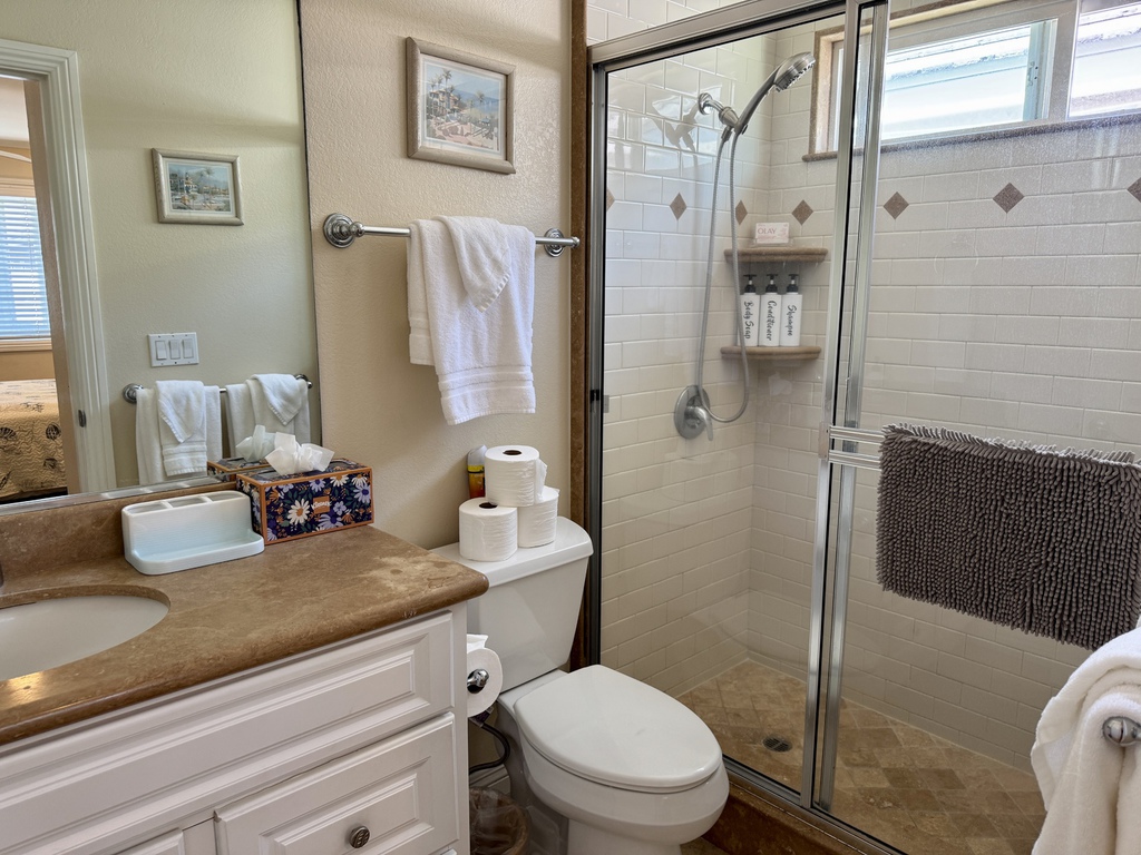 MASTER BATHROOM: Private bathroom that connects to the master bedroom. Recently remodeled tile walk-in shower with vanity sink/mirror.