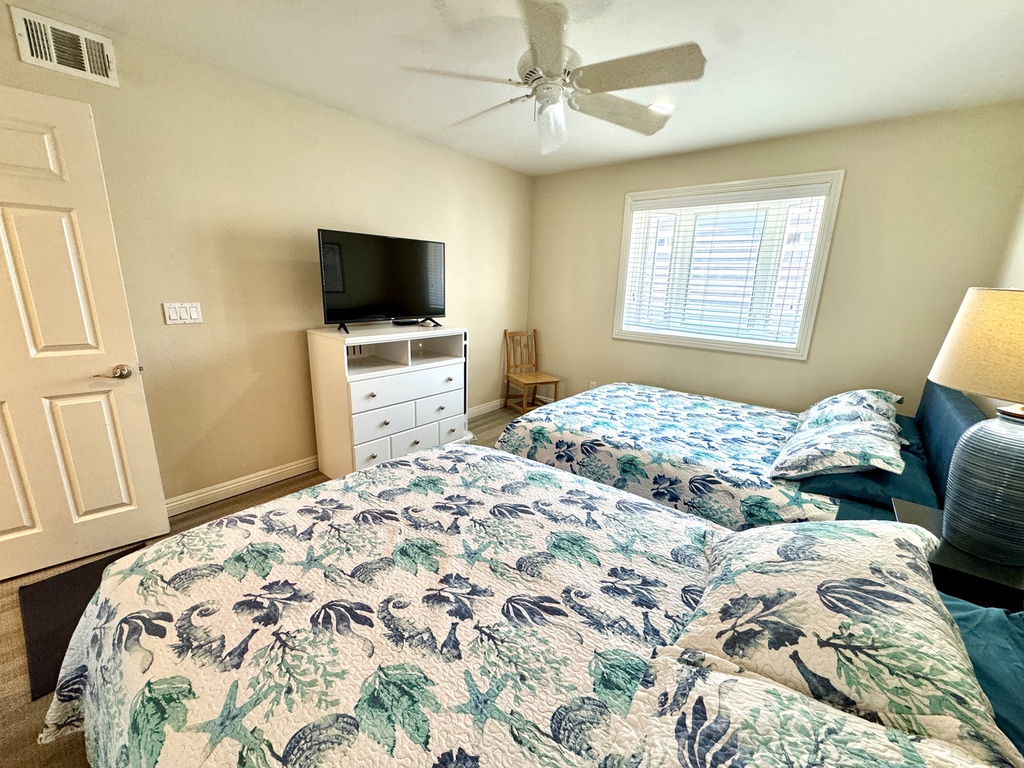 GUEST BEDROOM: This bedroom has 1 Queen Bed, a 42" smart TCL Tv, a 6 drawer dresser, mirrored wall closet floor fan and extra blankets. It also has 2 fold away twin cots in the closet to sleep 6 comfortable.