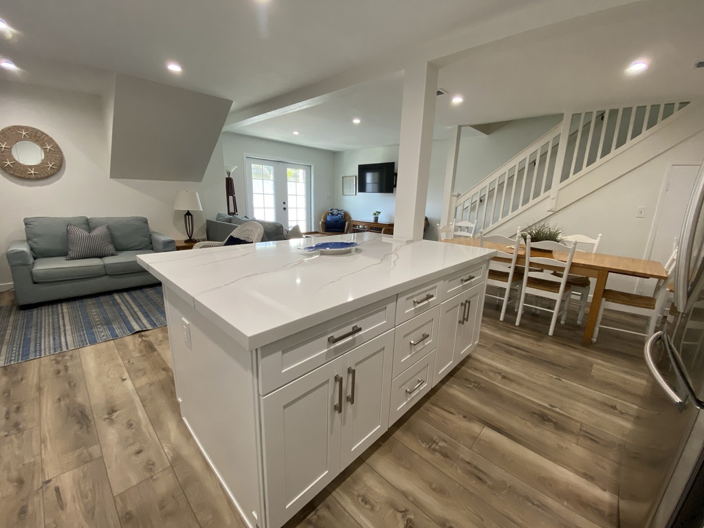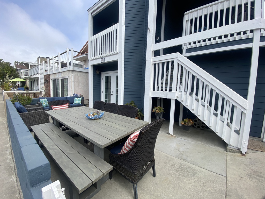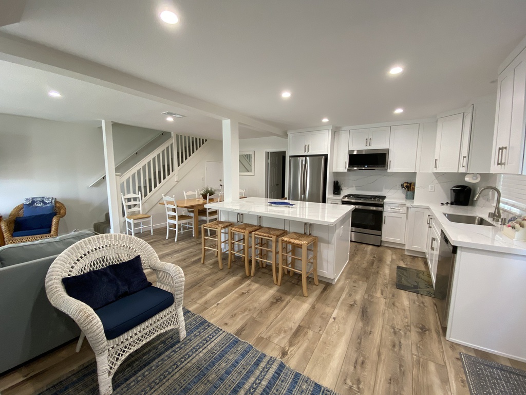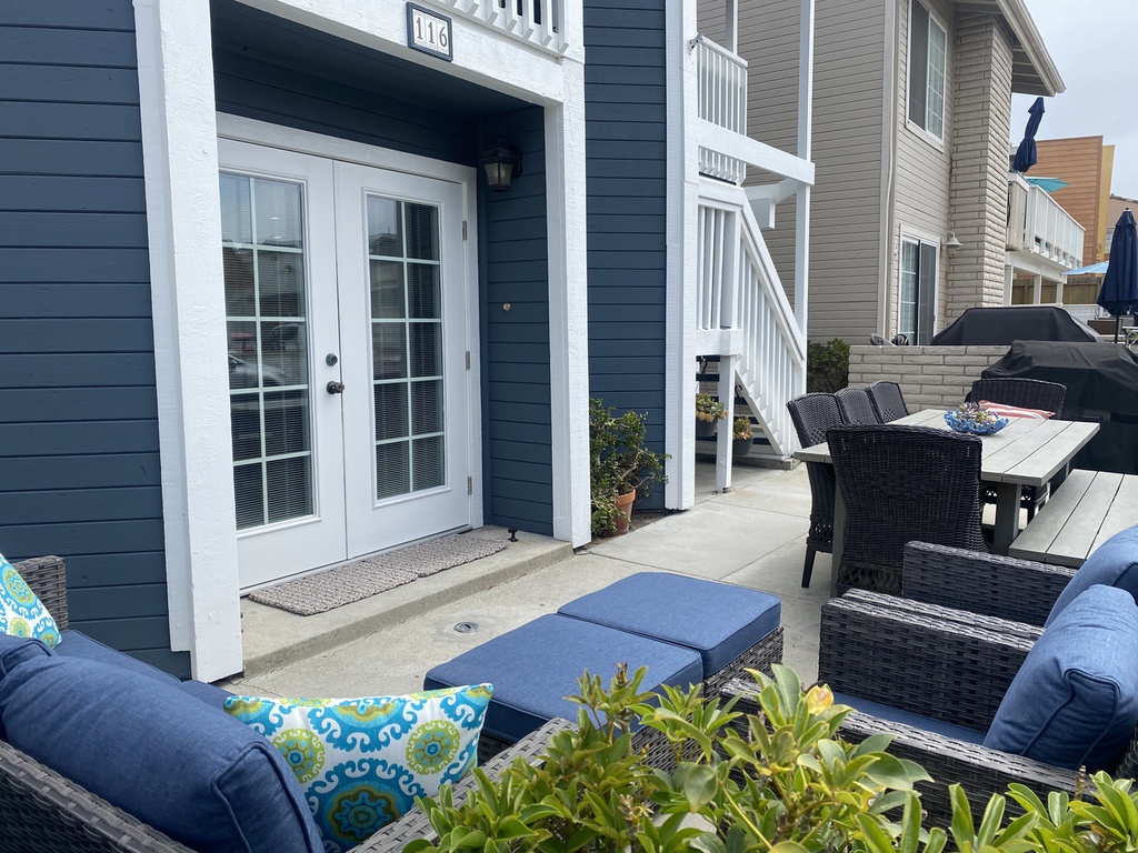 You're looking at beautifully remodeled home to make Treasured Memories! This 3bedroom 3 bath beach house has a unique 2 story layout with the downstairs consisting of a recently remodeled kitchen and living area, new french doors to the large exclusive front patio, comfortable furniture, 55" Smart TV with cable, 8 person dining table, a fully equipped kitchen, 1 bedroom and 3/4 size bathroom. The home was remodeled extending the kitchen and living room offering an additional 300 square feet to the living area and a beautiful kitchen with quartz countertops and modern kitchen cabinets. Enjoy the sand friendly laminate flooring in the kitchen and living room and new commercial grade carpet in the bedrooms. The welcoming beach house continues upstairs to the additional 2 Master bedrooms with 1 Jack n Jill full size bathroom and a 3/4 Bath in the other bathroom . The upstairs front bedroom includes a sunny patio with peek-a-boo view of the ocean. Patio can be seen in the top picture. (patio on the left).