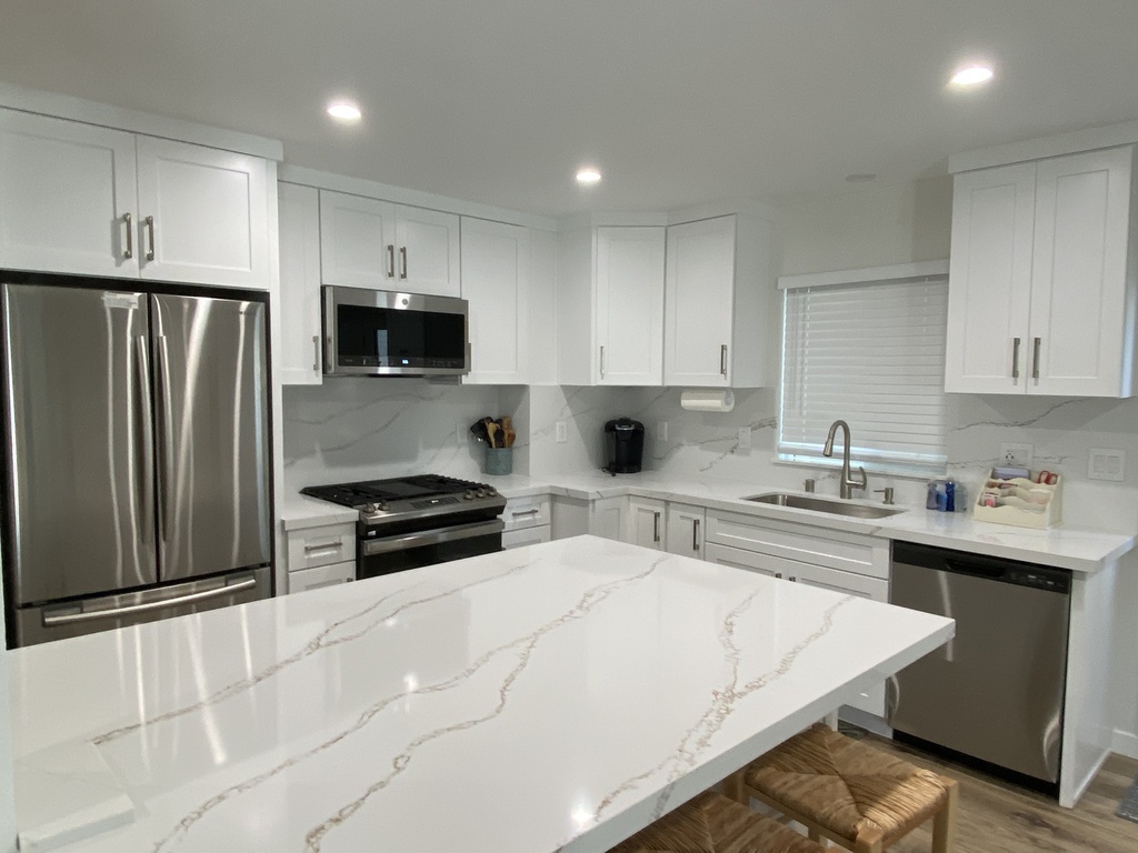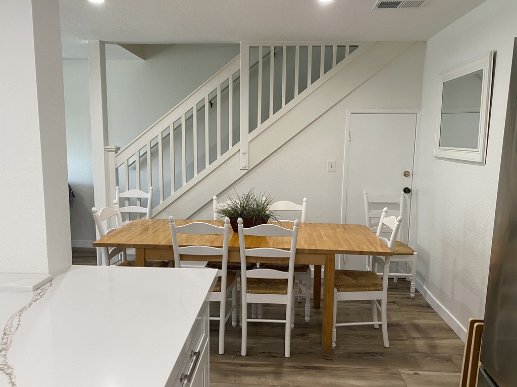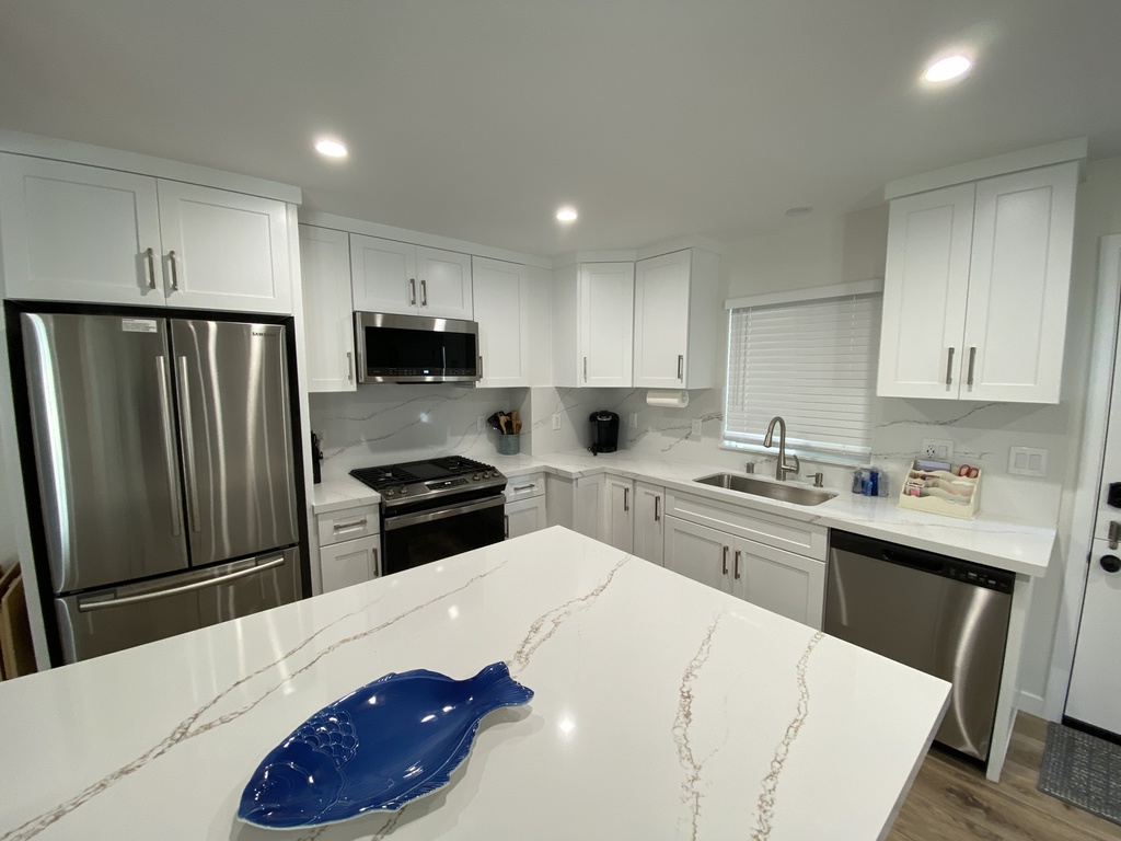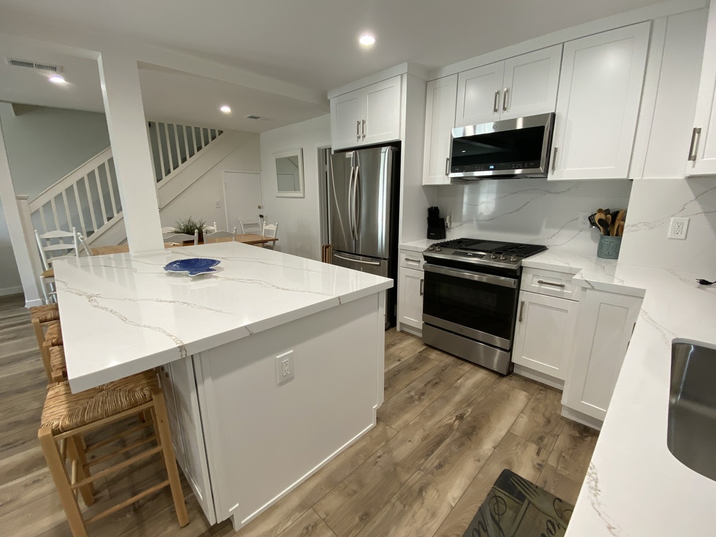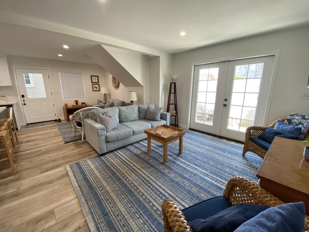 You're looking at beautifully remodeled home to make Treasured Memories! This 3bedroom 3 bath beach house has a unique 2 story layout with the downstairs consisting of a recently remodeled kitchen and living area, new french doors to the large exclusive front patio, comfortable furniture, 55" Smart TV with cable, 8 person dining table, a fully equipped kitchen, 1 bedroom and 3/4 size bathroom. The home was remodeled extending the kitchen and living room offering an additional 300 square feet to the living area and a beautiful kitchen with quartz countertops and modern kitchen cabinets. Enjoy the sand friendly laminate flooring in the kitchen and living room and new commercial grade carpet in the bedrooms. The welcoming beach house continues upstairs to the additional 2 Master bedrooms with 1 Jack n Jill full size bathroom and a 3/4 Bath in the other bathroom . The upstairs front bedroom includes a sunny patio with peek-a-boo view of the ocean. Patio can be seen in the top picture. (patio on the left).