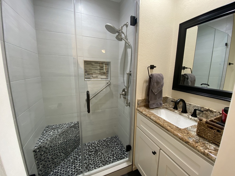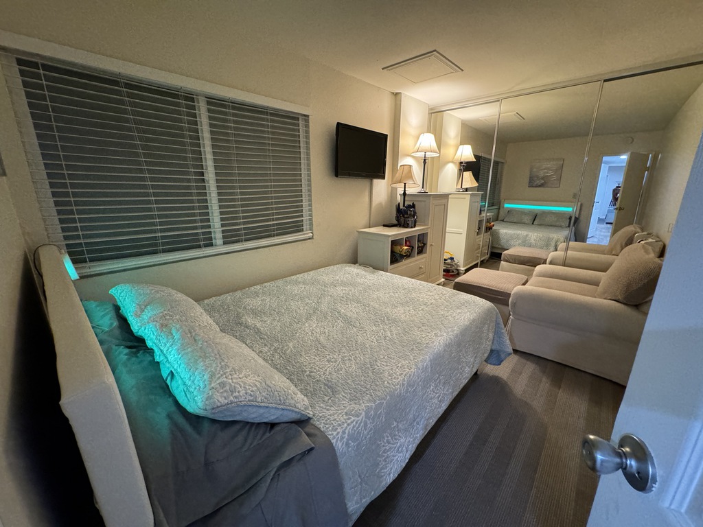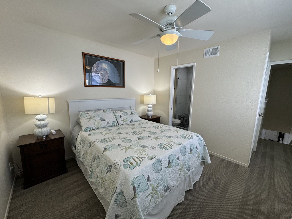 MASTER BEDROOM 2 UPSTAIRS: This bedroom is located upstairs with a 3/4 bathroom attached. It is supplied with a Queen bed, A 42" Smart TV, night stands, a dresser, alarm clock. a mirrored wall closet and extra blanket.