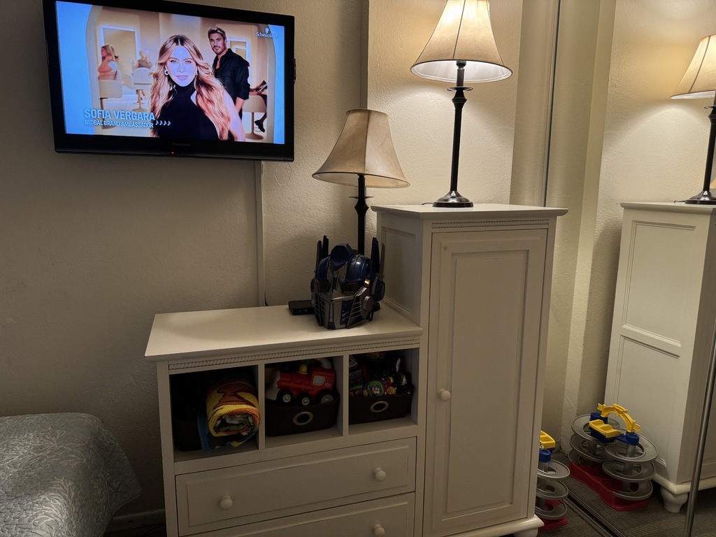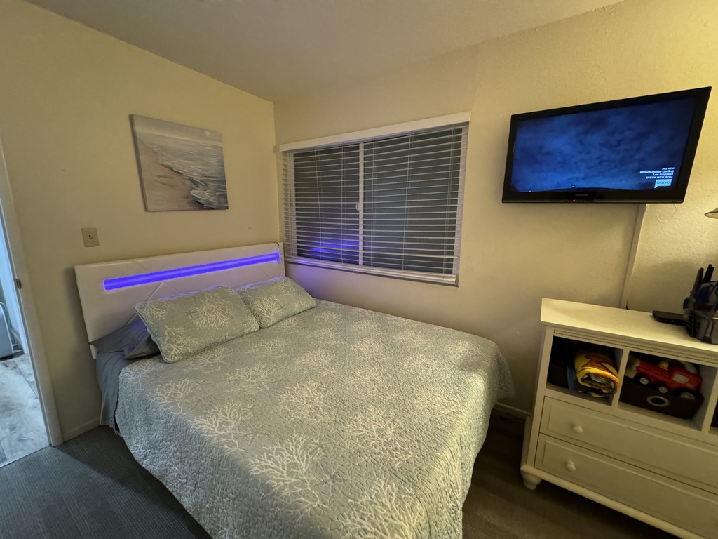 BEDROOM 1 DOWNSTAIRS: This bedroom is downstairs next to the 3/4 bathroom. It accomodates a queen bed, a dresser, a large mirrored wall closet, a Smart TV with remote, children's toys and games and extra blankets
