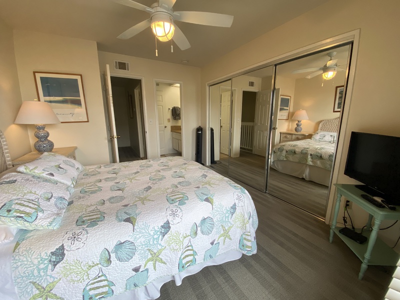 MASTER BEDROOM UPSTAIRS WITH PEEK-A-BOO VIEW: This master bedroom has a full size bathroom with tub/shower. It is also supplied with a queen bed, a 32" TV, 2 nightstands, a large mirrored wall closet, french doors opening to a balcony that has a peek a boo view of the ocean.