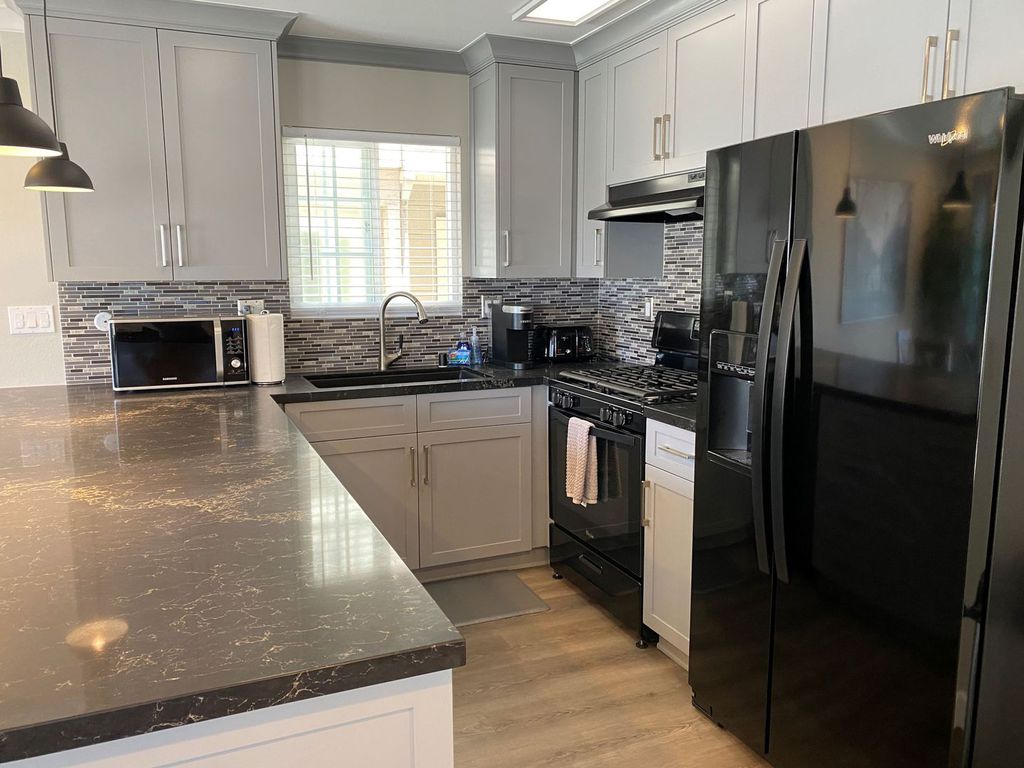 KITCHEN: The fully stocked kitchen with new granite countertops, New stainless steel appliances such as dishwasher, full size refrigerator, microwave and gas stove/oven of which is fully stocked for